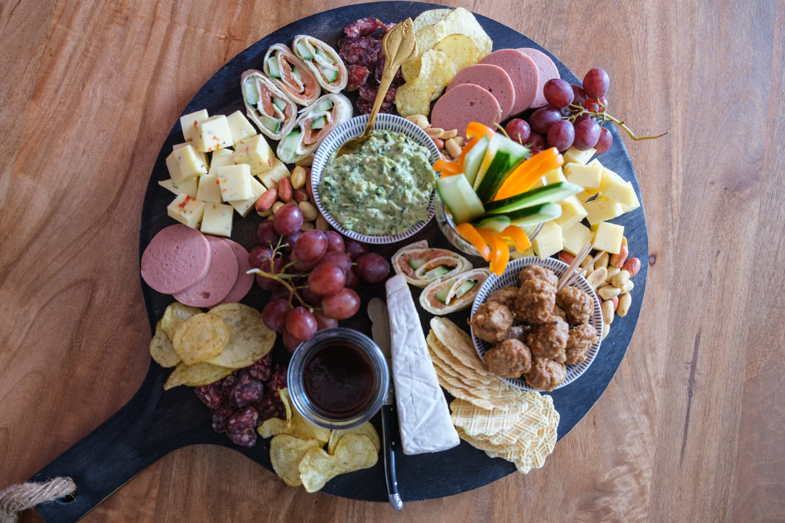 10. Dan wordt het tijd om de borrelplank op te maken: je kunt het beste beginnen met de schaaltjes, leg vervolgens de ‘losse’ borrelhapjes zoals kaas, worst, fruit, spiesjes, wraps en groenten op de borrelplank. Vul het daartussen op met nootjes en toastjes en serveer de warme hapjes in losse schaaltjes erbij op tafel.